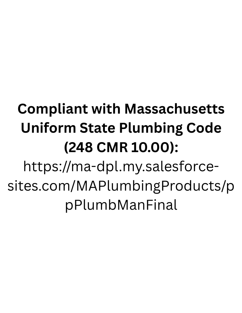 • ASSE 1014-2020 plumbing standard compliant, tested, and CERTIFIED. MASSACHUSETTS Uniform State Plumbing Code (248 CMR 10.00) approved.